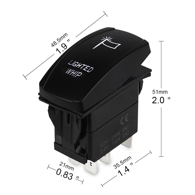 LED Lighted Whip Rocker Switch for RZRs, UTVs, Jeeps, and other off-road purposes. Most rocker switches are universal and should fit most available switch slots. We recommend installing a switch with your Gorilla Whips lighted accessories, including led whips, rock lights and glow kits.